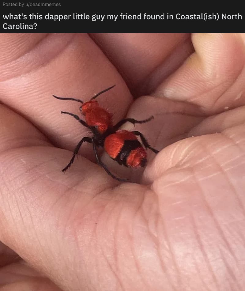 Female wingless wasp. AKA: A cow killer. AKA: A velvet ant.
