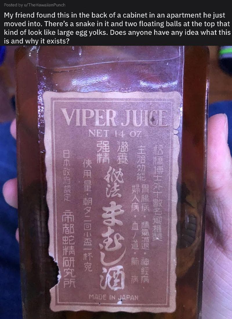 It was trapped alive in a sake bottle half filled with water. The practice is to leave it in there for a week or two to “empty out,” then pour out the water and refill it with awamori [an alcoholic beverage], drowning the snake.